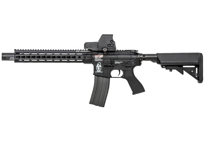 Never before have we built a gun with such a high value per dollar ratio. The base gun is a special Combat Machine M4 Blowback with a crane stock that's wired to the back. The brilliant techs at Airsoft GI have fitted this fine gun with the Madbull PWS Front End Conversion Kit. As a result, the final product is a CQB-range carbine with unique looks and functionality. This is a part of a new line up of guns to be manufactured by Airsoft GI. We've worked out a special program with Combat Machine to build us a special pneumatic blowback M4 with a crane stock, sling mount, and the wires to the back, so we can eliminate the need for a PEQ box and keep a clean look. The Combat Machine was carefully chosen for their high quality, reliability and incredible value. We've dropped the G4 straight onto the ground from 8ft and 9ft with no visible damage to the body, this is the strongest plastic receiver on the market. Additionally, with the innovation and imagination from the Airsoft GI technical team we are building some of the highest quality guns that money can buy.